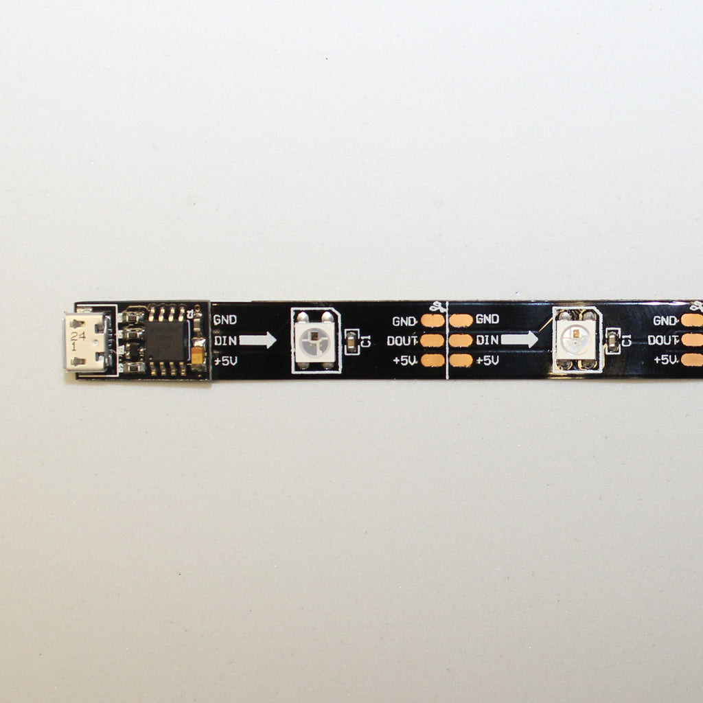 BlinkStick Flex Board barely fits on your fingertip, but allows you to control up to 32 WS2812 LEDs on a flexible strip. It's smart enough to automatically adjust the power draw from the USB port based on how many LEDs are controlled.